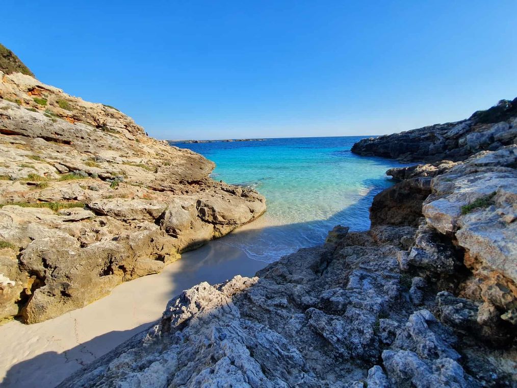 La cala de Ses Olles, se encuentra cerca del pueblo de pescadores de Binibeca. No tiene arena, exclusivamente un par de plataformas de piedra en la que podremos echar la toalla.